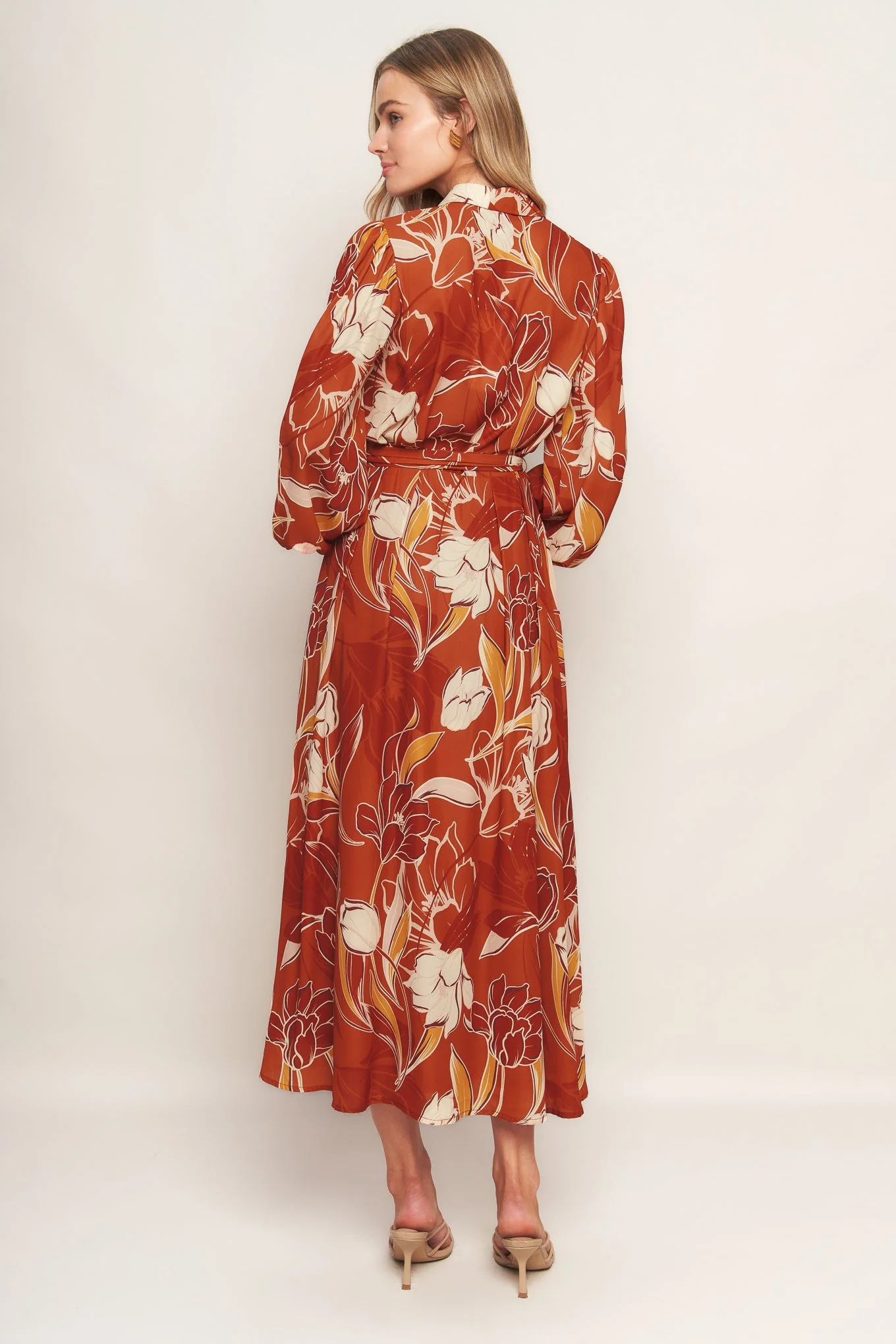 A printed woven midi dress featuring shirt collar, V neckline, long sleeves, button down, self sash tie and full skirt